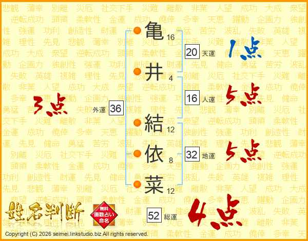 亀(16画)井(4画) 結(12画)依(8画)菜(12画)
