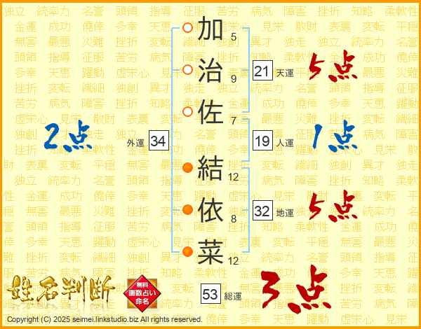 加(5画)治(9画)佐(7画) 結(12画)依(8画)菜(12画)