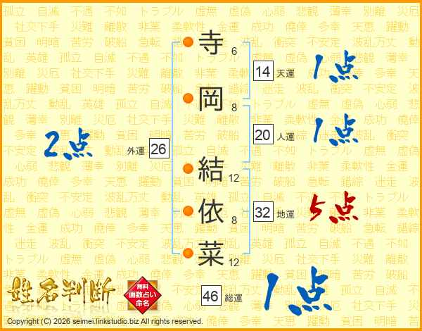 寺(6画)岡(8画) 結(12画)依(8画)菜(12画)