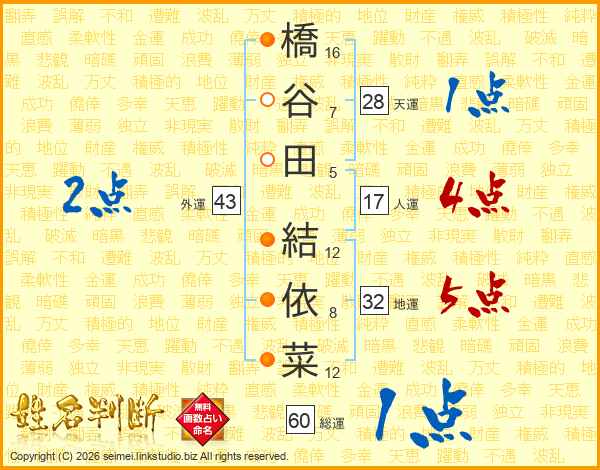 橋(16画)谷(7画)田(5画) 結(12画)依(8画)菜(12画)
