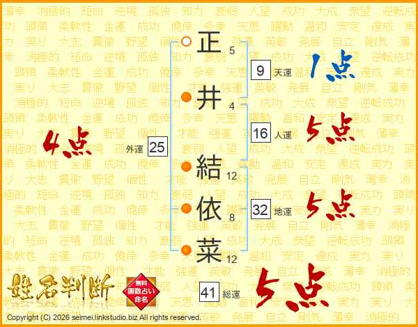 正(5画)井(4画) 結(12画)依(8画)菜(12画)