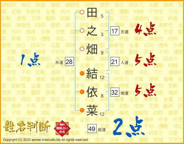 田之畑結依菜さんの総運は49画の2点!