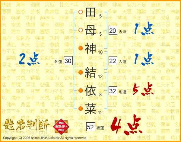 田(5画)母(5画)神(10画) 結(12画)依(8画)菜(12画)