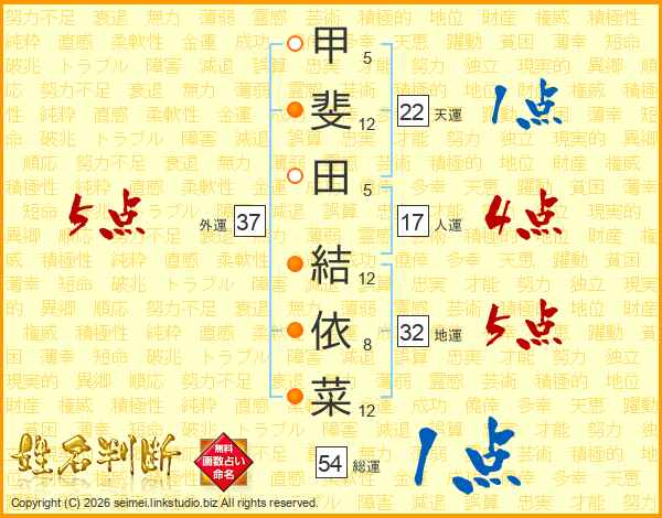 甲(5画)斐(12画)田(5画) 結(12画)依(8画)菜(12画)