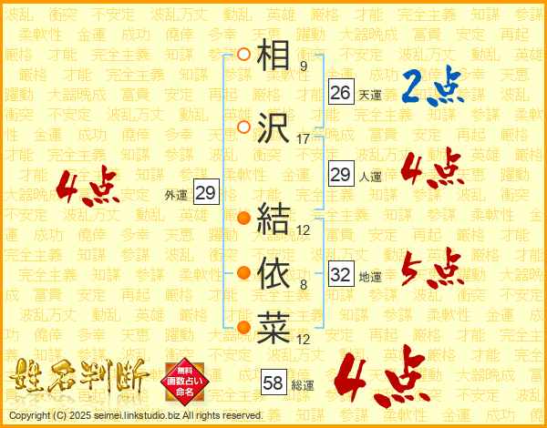 相(9画)沢(17画) 結(12画)依(8画)菜(12画)
