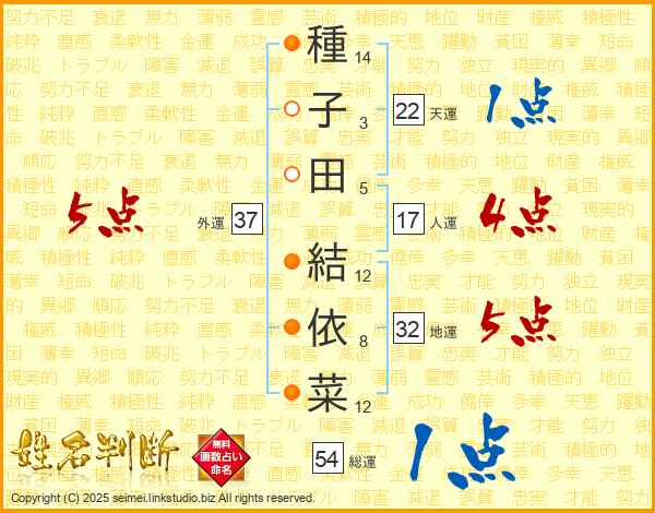 種(14画)子(3画)田(5画) 結(12画)依(8画)菜(12画)