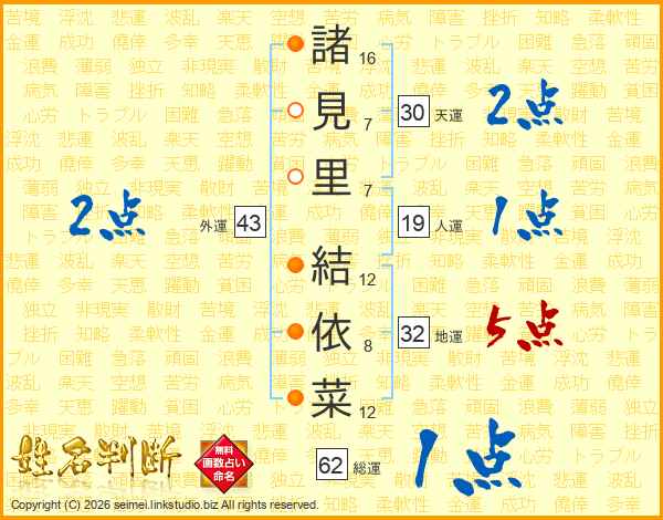 諸(16画)見(7画)里(7画) 結(12画)依(8画)菜(12画)