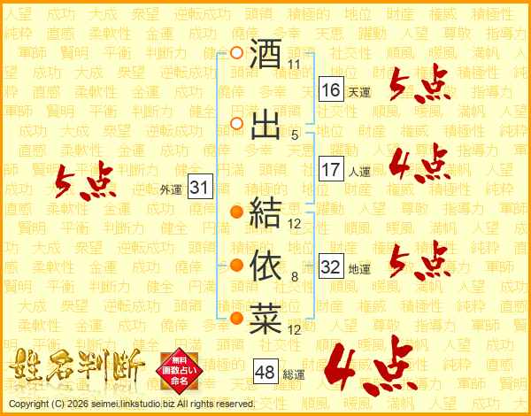 酒(11画)出(5画) 結(12画)依(8画)菜(12画)