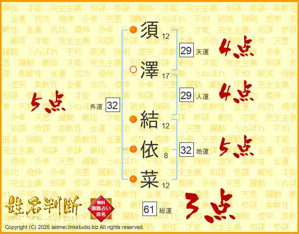 須(12画)澤(17画) 結(12画)依(8画)菜(12画)