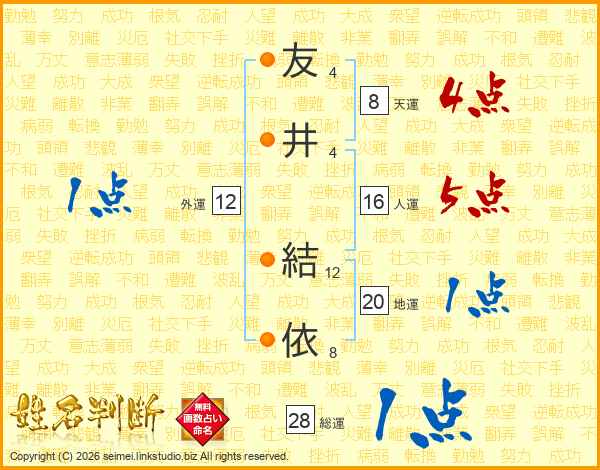 友(4画)井(4画) 結(12画)依(8画)