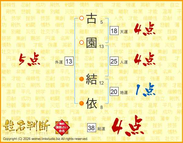生活面を象徴する運勢です。外部から受ける影響力を表し、結婚運、家庭運や職場、環境への順応性を表します。総運から人運を引いた画数。姓や名が1文字の場合を除く。