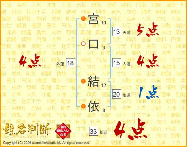 生活面を象徴する運勢です。外部から受ける影響力を表し、結婚運、家庭運や職場、環境への順応性を表します。総運から人運を引いた画数。姓や名が1文字の場合を除く。