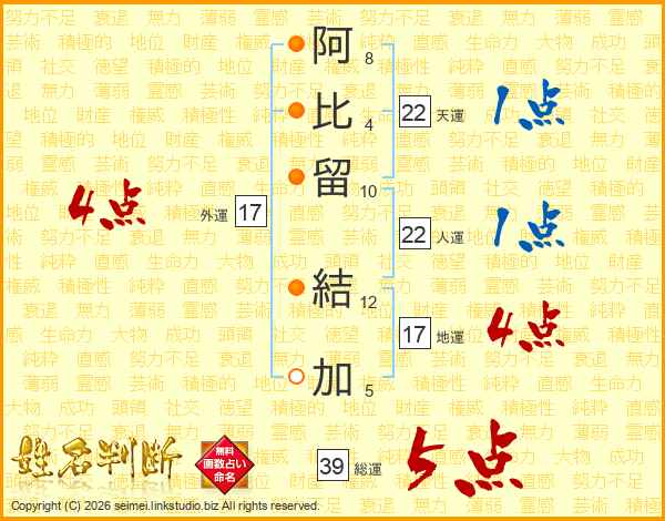 阿(8画)比(4画)留(10画) 結(12画)加(5画)