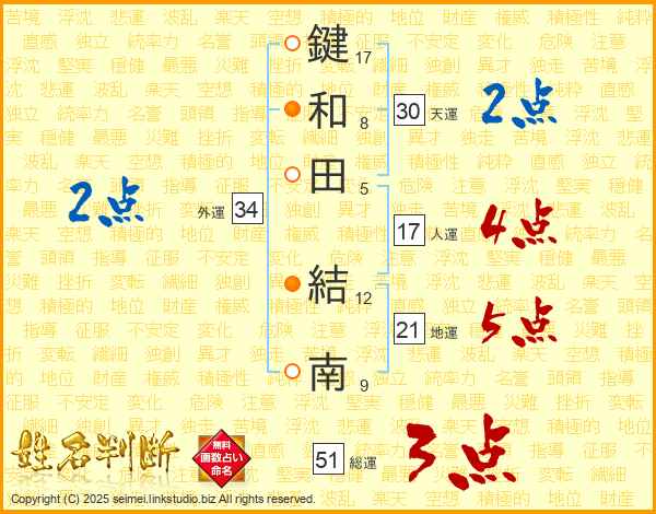 鍵(17画)和(8画)田(5画) 結(12画)南(9画)