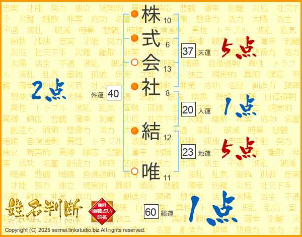 株(10画)式(6画)会(13画)社(8画) 結(12画)唯(11画)