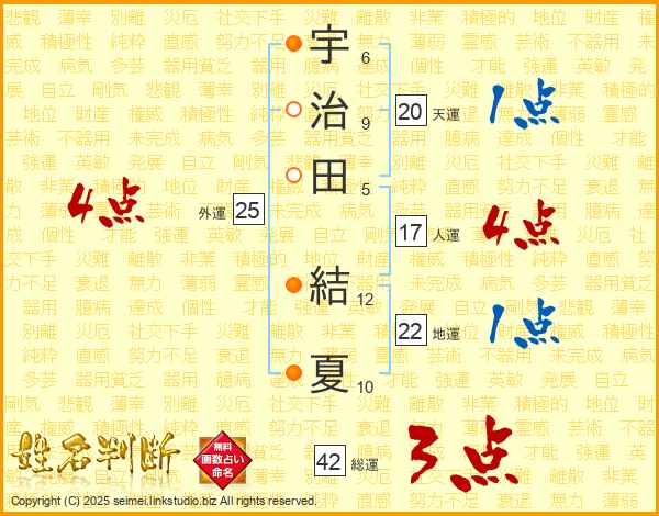 宇(6画)治(9画)田(5画) 結(12画)夏(10画)