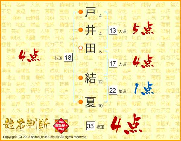 戸(4画)井(4画)田(5画) 結(12画)夏(10画)
