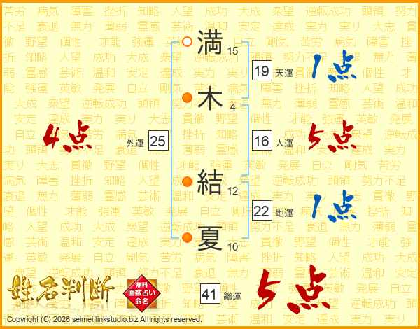 満(15画)木(4画) 結(12画)夏(10画)