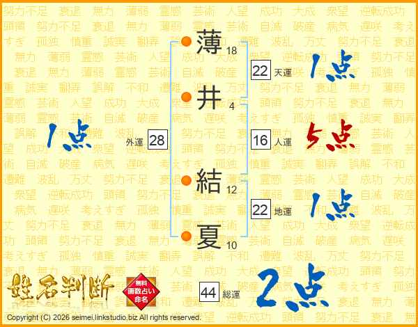 生活面を象徴する運勢です。外部から受ける影響力を表し、結婚運、家庭運や職場、環境への順応性を表します。総運から人運を引いた画数。姓や名が1文字の場合を除く。