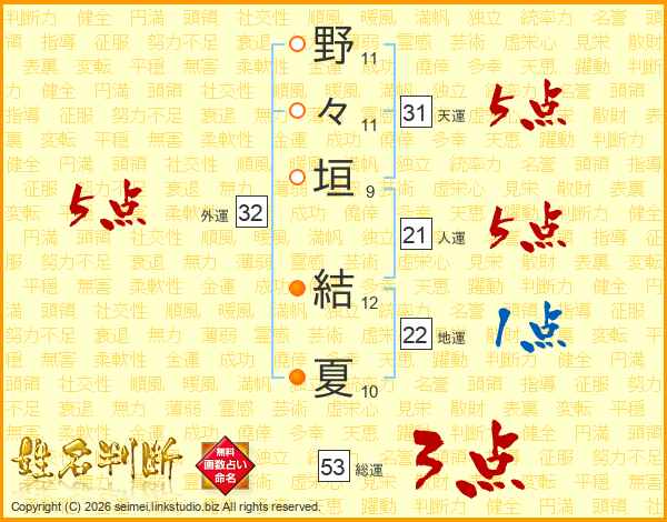 野(11画)々(11画)垣(9画) 結(12画)夏(10画)