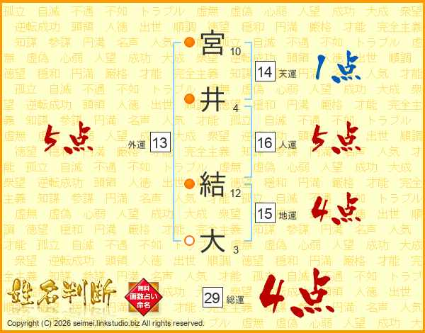 生活面を象徴する運勢です。外部から受ける影響力を表し、結婚運、家庭運や職場、環境への順応性を表します。総運から人運を引いた画数。姓や名が1文字の場合を除く。