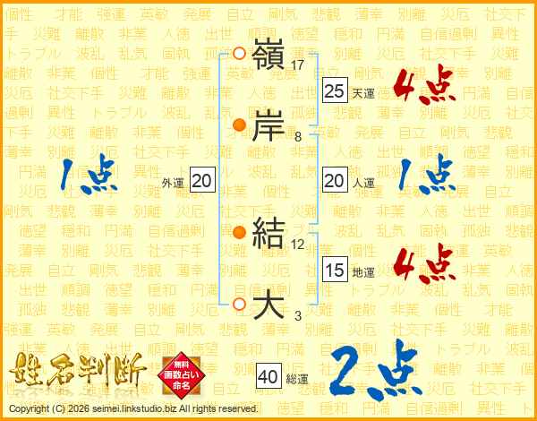 嶺(17画)岸(8画) 結(12画)大(3画)
