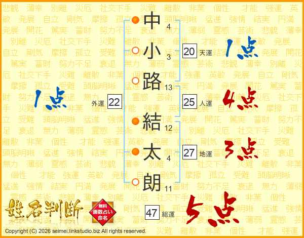 中(4画)小(3画)路(13画) 結(12画)太(4画)朗(11画)
