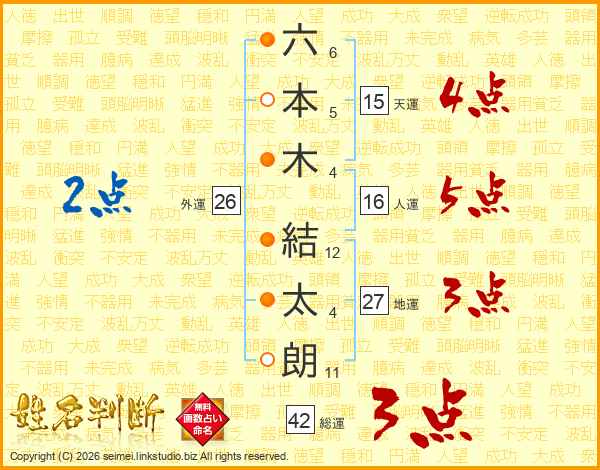 六(6画)本(5画)木(4画) 結(12画)太(4画)朗(11画)