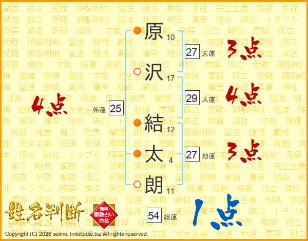 原(10画)沢(17画) 結(12画)太(4画)朗(11画)