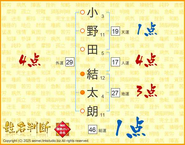 小(3画)野(11画)田(5画) 結(12画)太(4画)朗(11画)