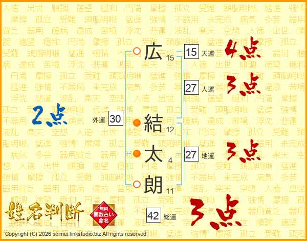生活面を象徴する運勢です。外部から受ける影響力を表し、結婚運、家庭運や職場、環境への順応性を表します。総運から人運を引いた画数。姓や名が1文字の場合を除く。