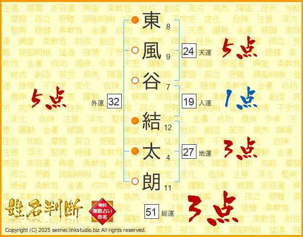 東(8画)風(9画)谷(7画) 結(12画)太(4画)朗(11画)