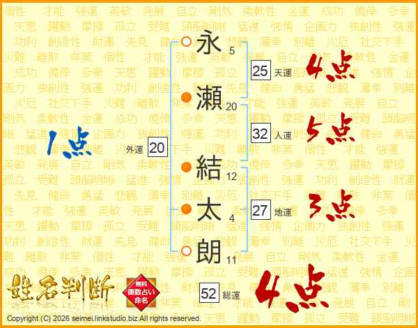 永(5画)瀬(20画) 結(12画)太(4画)朗(11画)