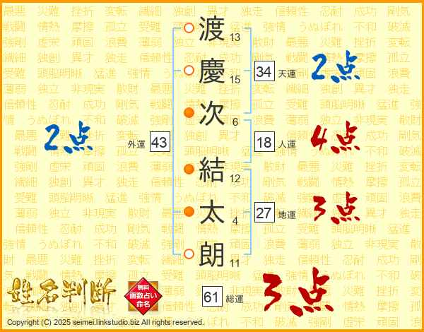渡(13画)慶(15画)次(6画) 結(12画)太(4画)朗(11画)