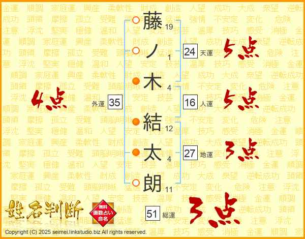 藤(19画)ノ(1画)木(4画) 結(12画)太(4画)朗(11画)