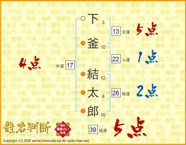 下(3画)釜(10画) 結(12画)太(4画)郎(10画)