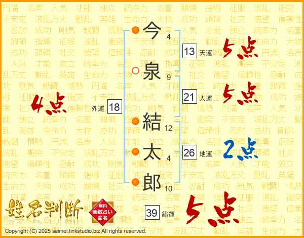 今(4画)泉(9画) 結(12画)太(4画)郎(10画)
