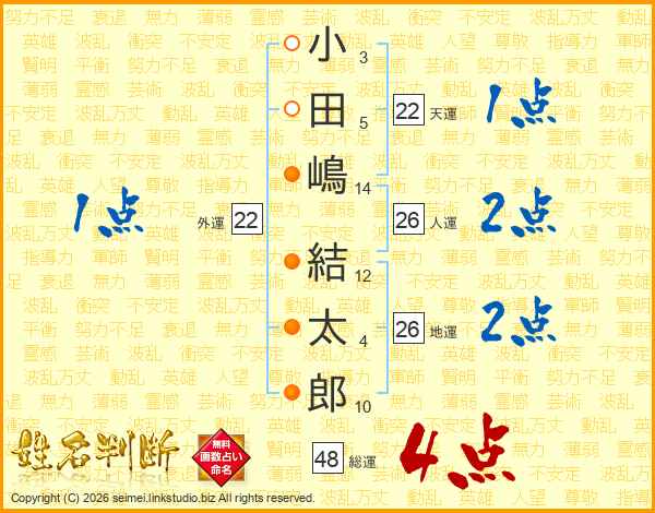 小(3画)田(5画)嶋(14画) 結(12画)太(4画)郎(10画)