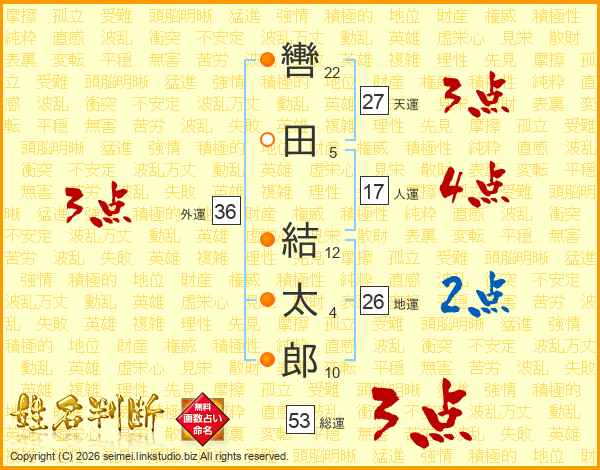 轡(22画)田(5画) 結(12画)太(4画)郎(10画)