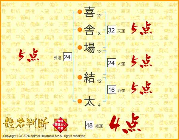 喜(12画)舎(8画)場(12画) 結(12画)太(4画)