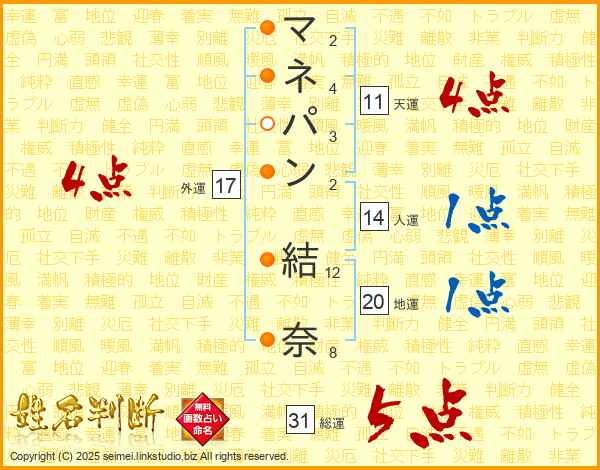 マ(2画)ネ(4画)パ(3画)ン(2画) 結(12画)奈(8画)