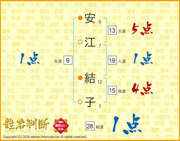 安(6画)江(7画) 結(12画)子(3画)