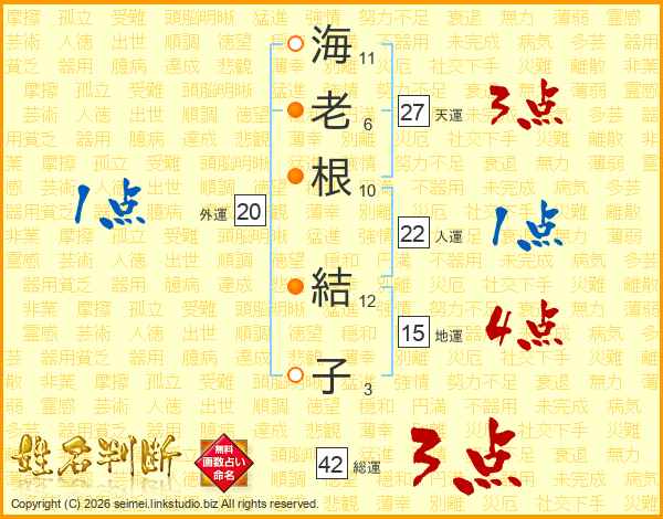 海(11画)老(6画)根(10画) 結(12画)子(3画)