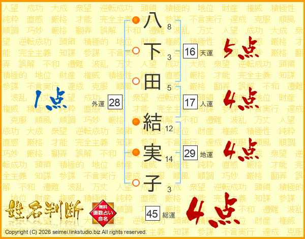 八下田結実子さんの総運は45画の4点!