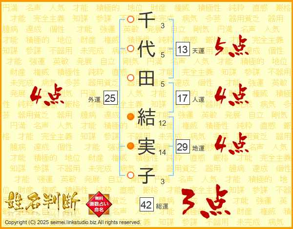 千(3画)代(5画)田(5画) 結(12画)実(14画)子(3画)