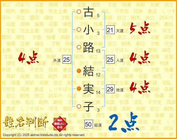 古(5画)小(3画)路(13画) 結(12画)実(14画)子(3画)