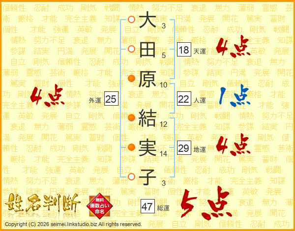 大(3画)田(5画)原(10画) 結(12画)実(14画)子(3画)