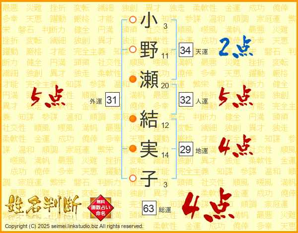 小(3画)野(11画)瀬(20画) 結(12画)実(14画)子(3画)