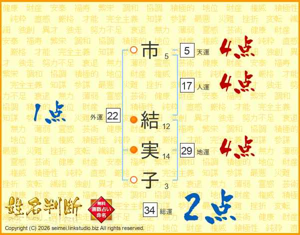 生活面を象徴する運勢です。外部から受ける影響力を表し、結婚運、家庭運や職場、環境への順応性を表します。総運から人運を引いた画数。姓や名が1文字の場合を除く。