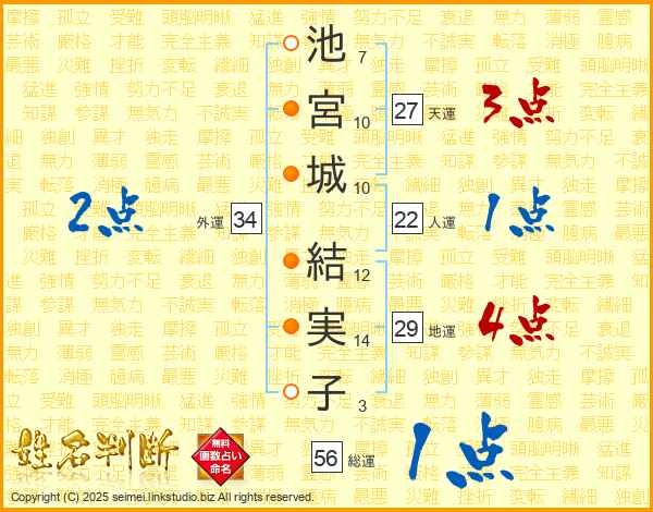 池(7画)宮(10画)城(10画) 結(12画)実(14画)子(3画)